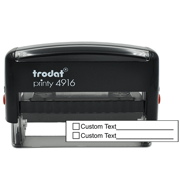 Custom rubber stamp features a 2 line box form with custom text and lines beside it. Great if you need to choose between two options. Makes thousands of crisp, clear impressions.