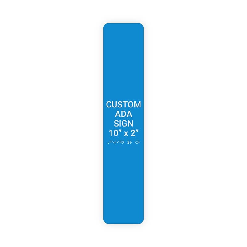 This Vertical ADA sign adheres to the following ADA guidelines: Braille must be centered directly under the text, but must have at least 5/8" space on both sides Text should be in ALL CAPS (unless explaining directions) and should be in block type font (Helvetica, Arial, etc.) Text must not be more than 2" tall and must be at least 5/8" tall The Vertical ADA Sign follows proper ADA guidelines and is vital to your home or business. Order your Vertical ADA sign now!
