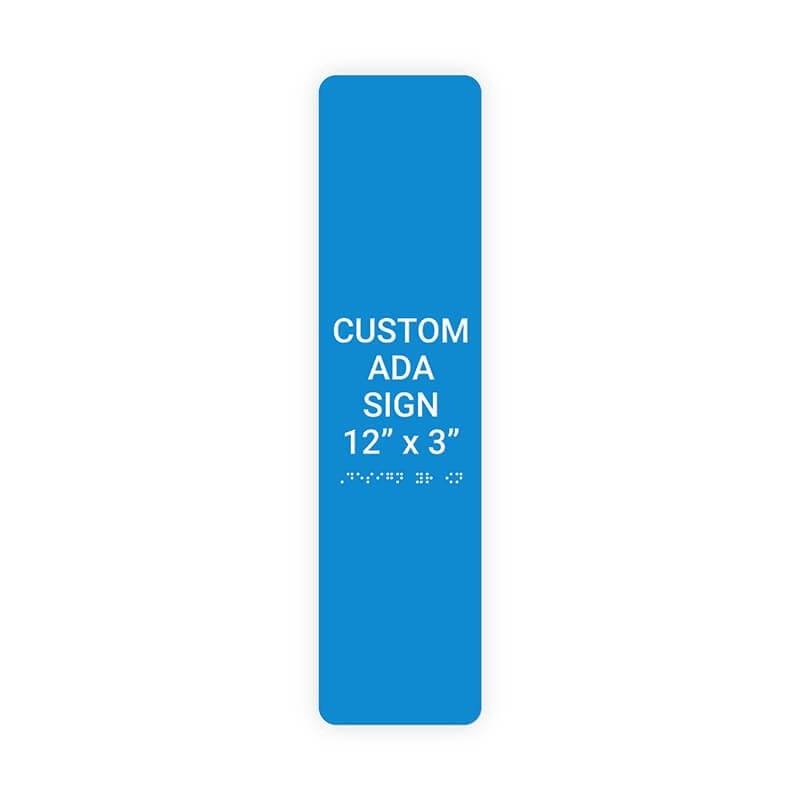 This Vertical ADA sign adheres to the following ADA guidelines: Braille must be centered directly under the text, but must have at least 5/8" space on both sides Text should be in ALL CAPS (unless explaining directions) and should be in block type font (Helvetica, Arial, etc.) Text must not be more than 2" tall and must be at least 5/8" tall The Vertical ADA Sign follows proper ADA guidelines and is vital to your home or business. Order your Vertical ADA sign now!