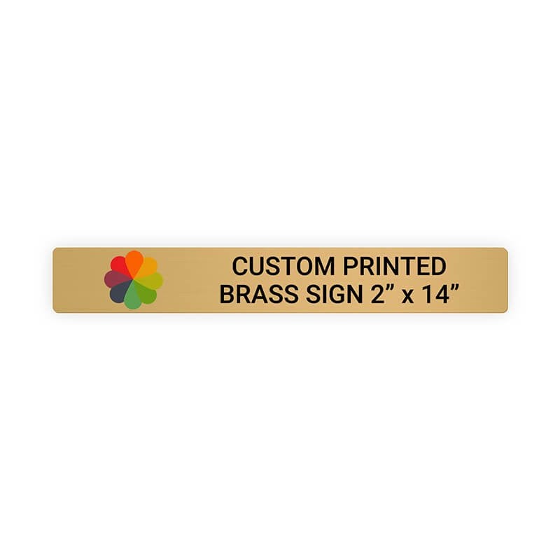 Our 2" x 14" Horizontal Full Color Brass Signs add a cohesive, professional look to any office space. Includes several customization options, including company logo and optional UV coating, and can be installed practically anywhere!