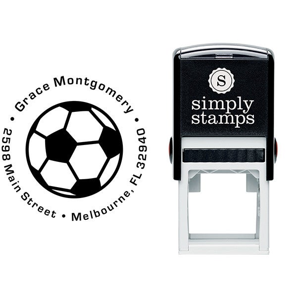 The Soccer Ball Return Address Stamp is the perfect stamp for an active individual but is particularly useful for teachers who instruct classrooms with younger individuals or teachers who instruct gym classes. It can also be a great addition to a personal stamp collection, as well. Show your kids or whoever is receiving your mail the great job that they've done, or that you like to spice your mail up with a little flair from the athletic department! The Soccer Ball Return Address Stamp features an accurately designed soccer ball in the center of the stamp, with a rotating series of information around the soccer ball which denotes the address. The Soccer Ball Return Address Stamp, apart from being uniquely designed, is also customizable in a variety of different ways such as color, stamp type, and size, and will certainly meet the specifications of any picky stamper's needs! The Soccer Ball Return Address Stamp is an athletic way to add a touch of creativity to any envelope or paper, regardless of what environment you're in or what you're using it for, and is also a great addition to any veteran stamper's stamp collection!